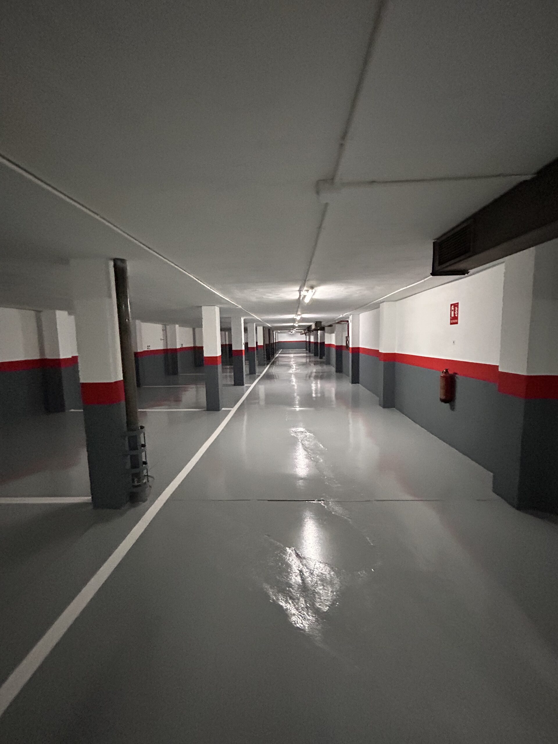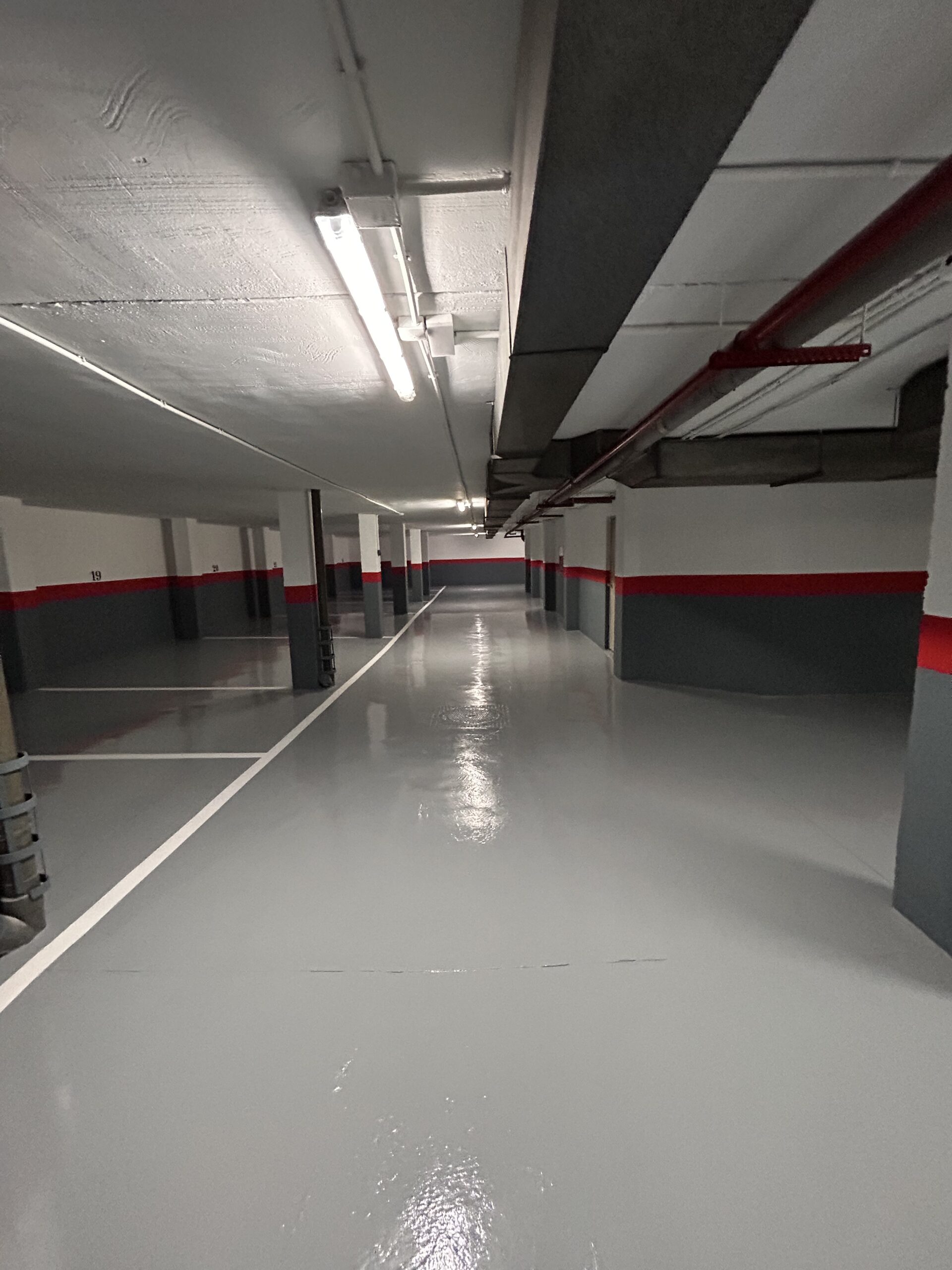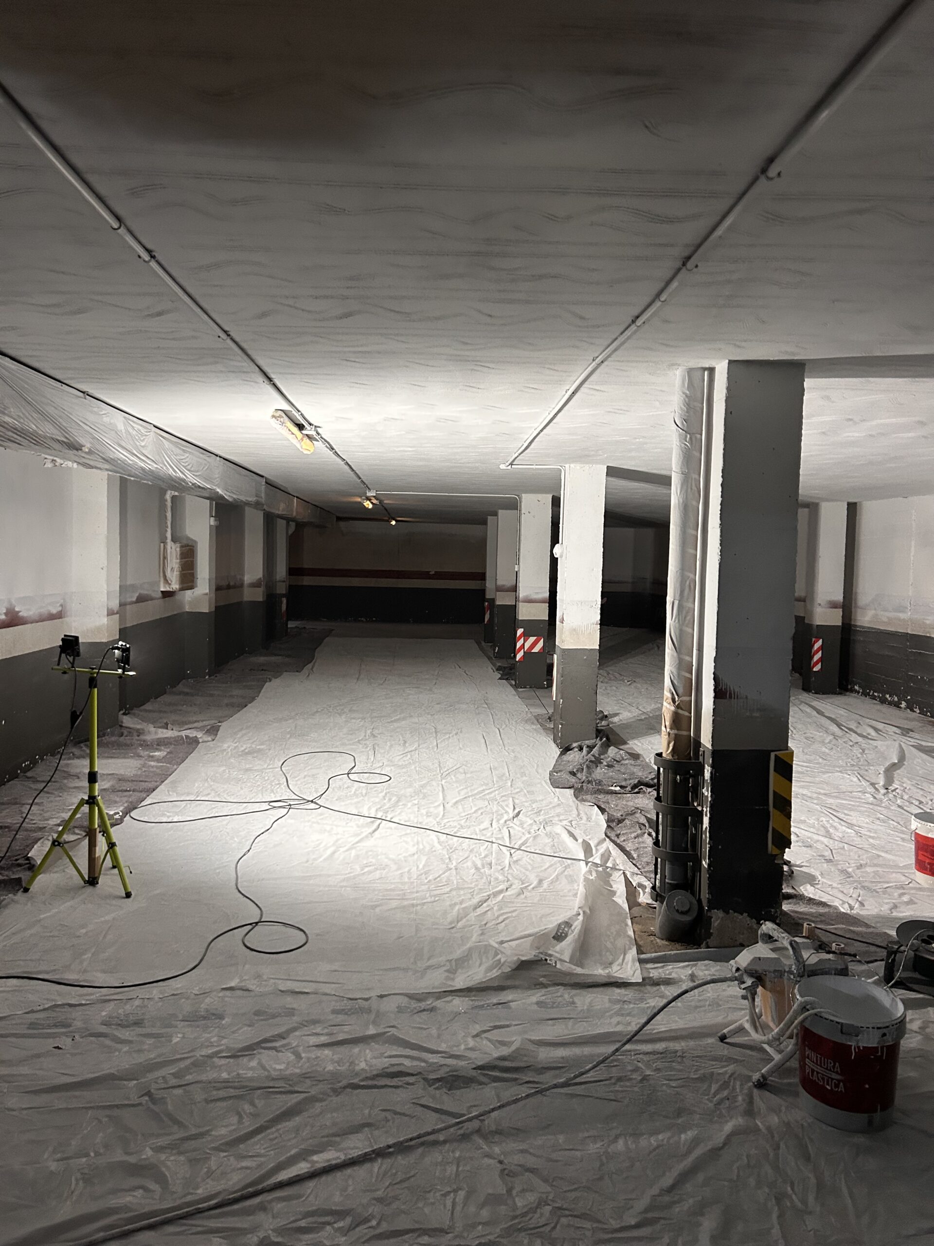 Hicimos un trabajo completo de rehabilitación de este parking. Techo,paredes, suelo, plazas y numeración.Primero se hicieron todos los arreglos necesarios.A continuación se pinto el techo en pintura plástica blanca.Después se pintaron las paredes y para terminar se pinto el suelo en epoxy con la plazas de aparcamiento y su numeración correspondiente en pintura de señalización blanca.Quedó totalmente nuevo.l